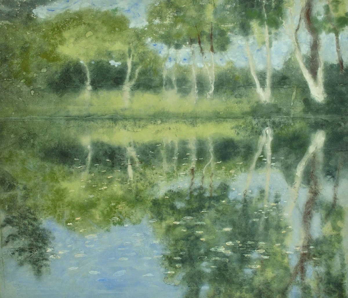 “Before a painting by Malgorzata Paszko, one’s admiration can’t be limited to the pictorial material and the way it is disposed-off; or to the unique beauty of the landscape, the greenery, the light and the reflections of the night atmosphere. One rather stay on an edge, hesitating; a hesitation that is not worrisome; in between gravity and flying away, in between material and image.” From Yves Michaud, monograph on the artist.