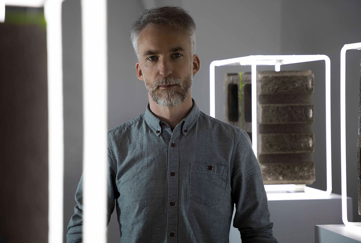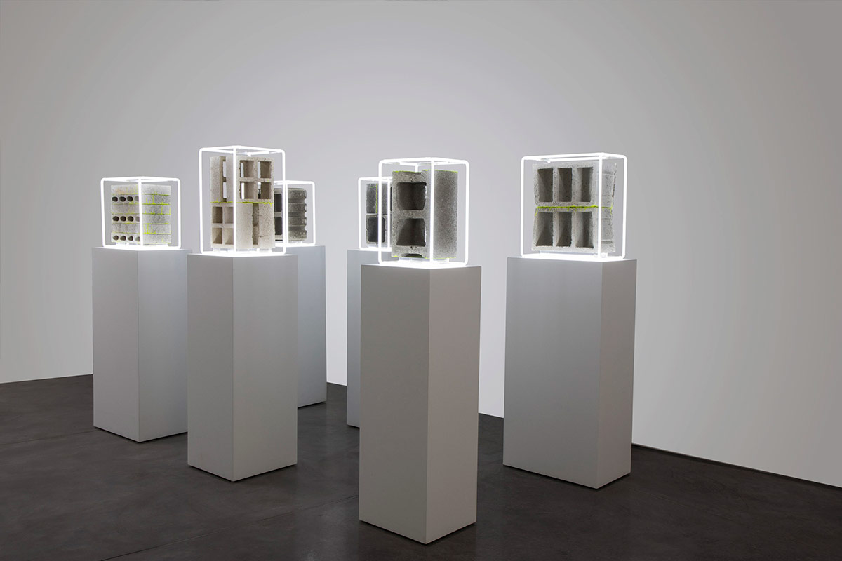 Occupying the central gallery are six new floor-based sculptural works: cement blocks, each illuminated by a cube of white neon creating a geometric halo of light. These sit alongside a new series of framed, mixed-media works on paper, Petrol Station Series, the scale of which will range from small works to one large scale piece.