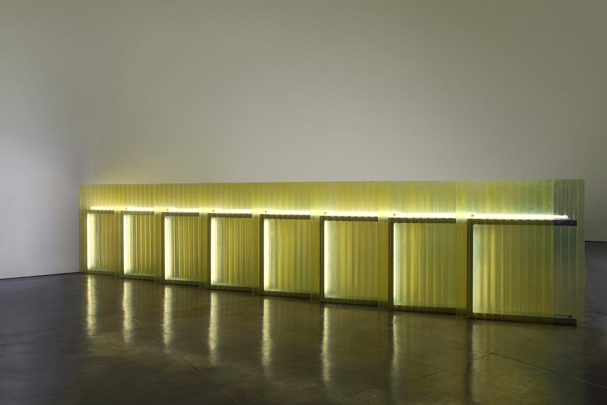 Dominating the entrance and cutting through the gallery space is a large scale installation, which invites viewers to interact with it by walking around or passing through it. The structure combines different construction materials, which have been locally-sourced – mass-produced, glass re-enforced plastic (GRP) sheeting and folded galvanised steel - with standard white fluorescent lights, creating a structure that hovers between minimal installation and building site. In the combination of familiar parts into a new aesthetic, Rackowe invites the viewer to reconsider their relationship with the city. The installation demonstrates a progression from Rackowe’s existing Pathfinding series of works, which similarly use locally-sourced blocks and light and which has been constructed in cities from Paris to Bangkok.