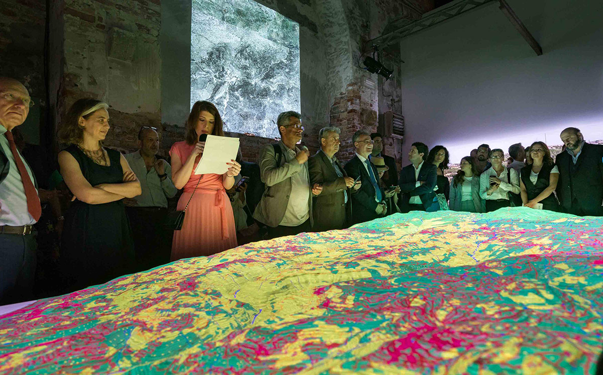 In order to evaluate the place that remains, “the place that could still host our dreams and expectations”, the main installation is a cartographic inventory, consisting of a series of maps projected on a wooden, 3D topographic model.